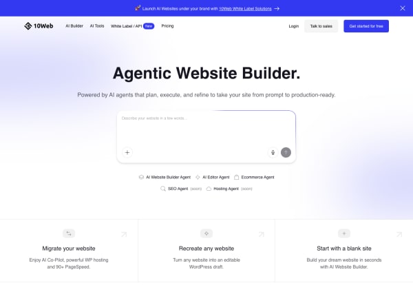 10Web is an AI-powered WordPress website builder and hosting platform. Describe your business and 10Web generates a complete, multi-page WordPress site with custom content, images, and design โ ready to launch in under a minute. It also provides managed WordPress hosting with automated backups, caching, and security.