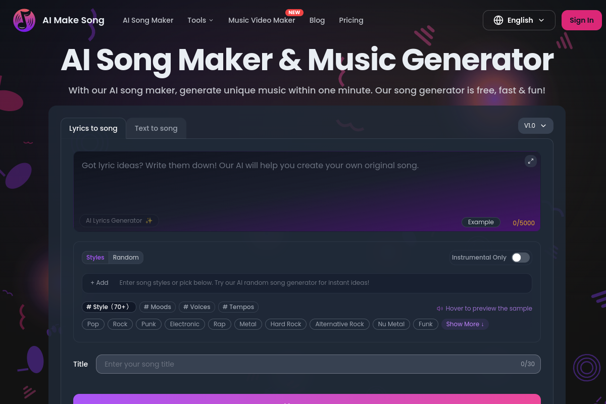AI Song Maker is a freemium audio AI tool by AI Make Song. AI Song Maker lets creators generate full songs from text prompts or lyrics, choose from a wide range of styles and voices, and produce copyright-safe tracks for videos, podcasts, games, and social content. It is aimed at fast music creation without needing studio experience.
