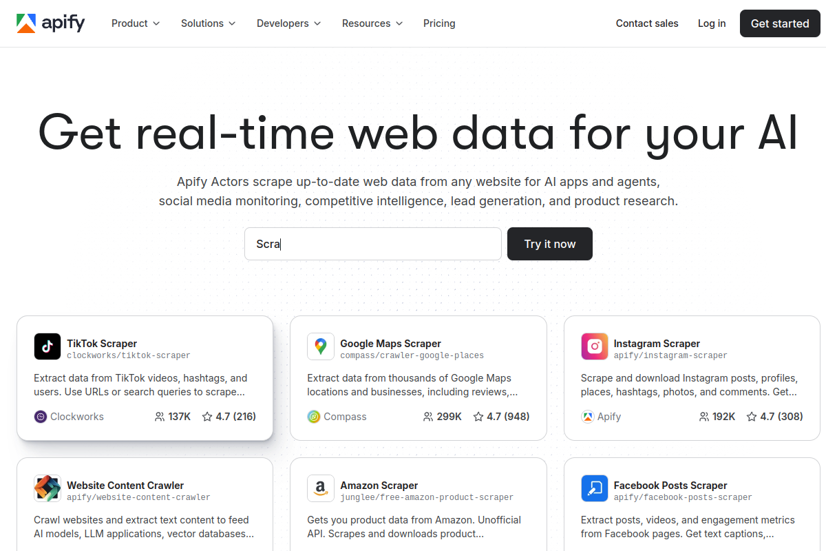 - +6,000+ pre-built scrapers and Actors gives the product a concrete primary use case.