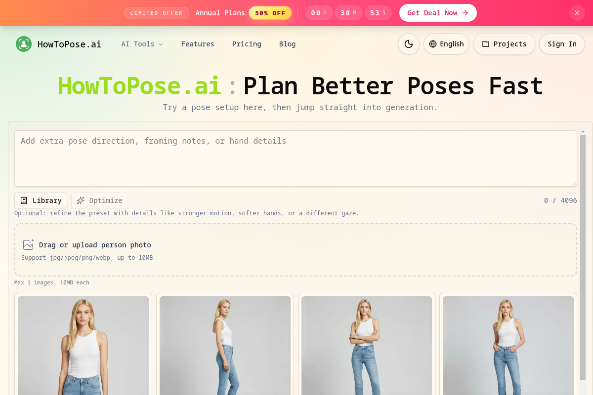 HowToPose.ai is a visual editing tool focused on pose adjustment, outfit swapping, and portrait enhancement for creators who want studio-style person imagery without reshooting manually. It is especially geared toward professional portrait and short-form visual content workflows.