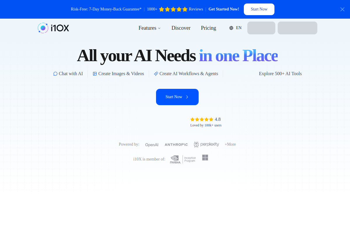 i10X bundles major AI models, specialized agents, document analysis, image generation, and workflow automation into a single workspace. It is aimed at users who want one subscription and one interface for writing, research, coding, and everyday business tasks.