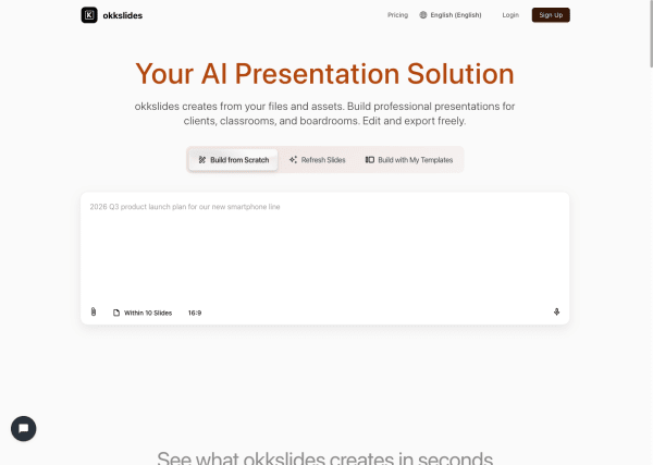 OKKSlides is an AI presentation tool that takes documents, PDFs, URLs, or plain text as input and transforms them into structured, visually polished slide decks in seconds. It auto-designs layouts, picks relevant images, and organizes content logically โ making it the fastest way to go from raw content to presentation-ready slides.