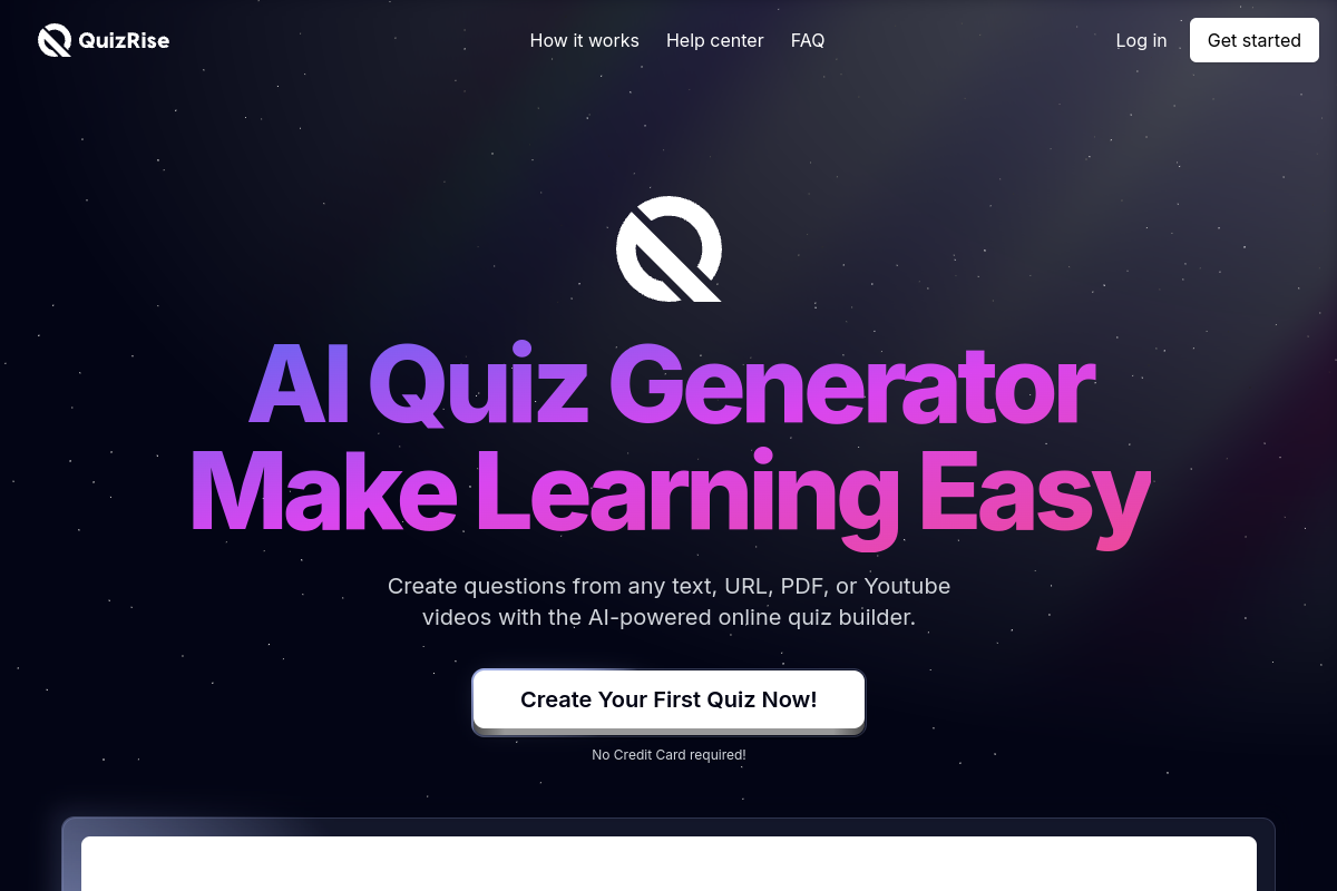 QuizRise helps students, teachers, and training teams generate quizzes and flashcards from study material in seconds. It supports input from text, websites, PDFs, and videos, then packages the results into shareable, editable learning content with exports and analytics.